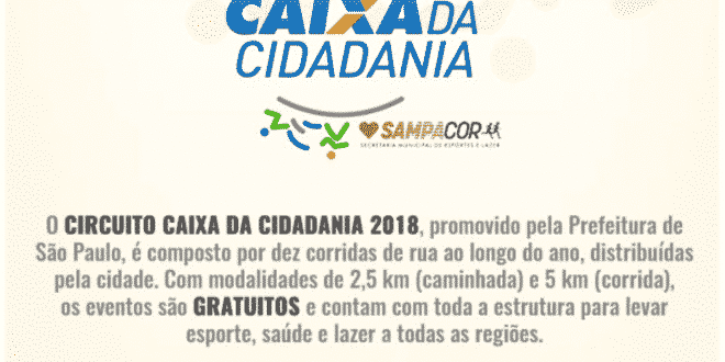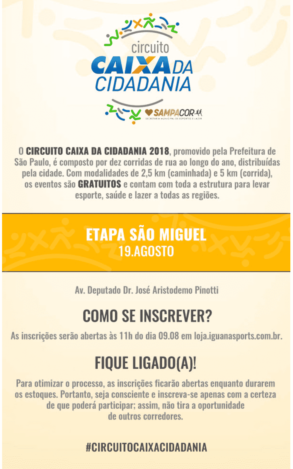 A Etapa São miguel do Circuito caixa da Cidadania 2018 terá abertura das suas inscrições quinta-feira, dia 09 de agosto de 2018 a partir das 11:00.