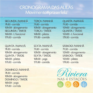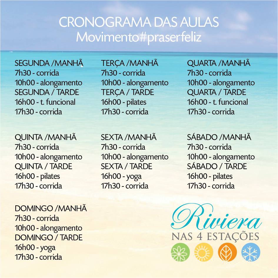 A praia da Riviera de São Lourenço, no litoral norte de São Paulo, em Bertioga, com o apoio do Pão de Açúcar colocou a disposição de todos o projeto Riviera nas 4 estações com aulas de corrida e caminhada, pilates, yoga, funcional, alongamento.
